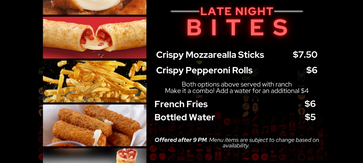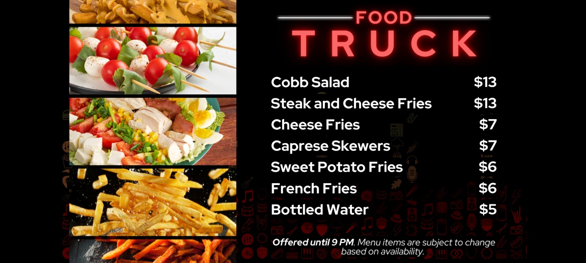 Get ready to fuel your concert night with flavor! Our food truck is serving up crowd-pleasing eats just steps from the stage—perfect for a quick bite or late-night snack. From mozzarella sticks to burgers, we've got the tastes that keep the good vibes going. Swing by and grab your favorites without missing a beat!